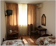 В номере: две кровати или двуспальная кровать, сплит-система, журнальный столик, шкаф, душ, холодильник, телевизор.